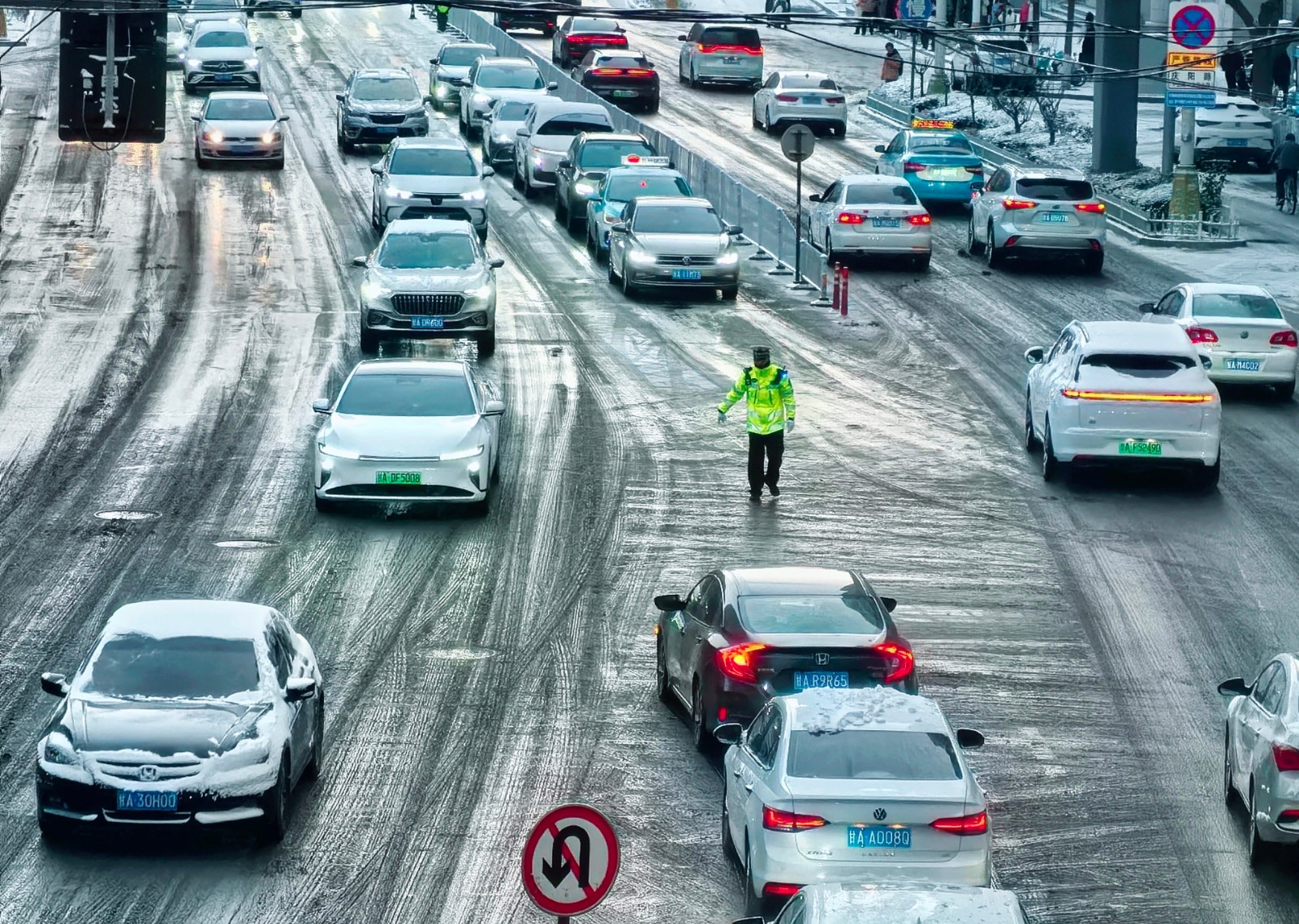 民警在全力疏导交通。11月24日,兰州城区出现大雪天气,兰州市公安局交管支队城关大队闻令而动,迅速启动恶劣天气应急保通预案,倾力保障辖区道路安全畅通。新甘肃•甘肃法治报记者 李维琴 摄